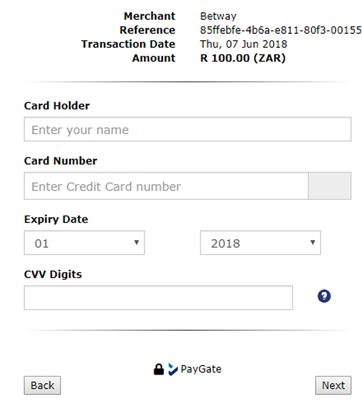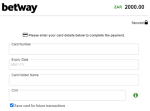 Card Transactions1Go to Betway.co.za and tap Login or Sign Up2Tap on the Menu ,and the My Account button. Then, tap Deposit Funds and select the Credit and Debit Card option.