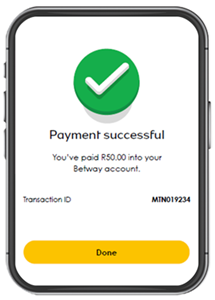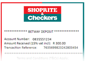Nedbank App1Log into your Nedbank app2Tap “Pay” and select “Single Payment”3Tap on the “Search” button4Select “Bank Approved”56Enter the amount you want to deposit7Enter your Betway account number (mobile number) as the recipient reference8Complete the transactionShoprite and Checkers Money Market1Visit your nearest Shoprite or Checkers store2Go to the Money Market counter3Give the agent your Betway account number and the amount you want to deposit4The agent will confirm your account by asking for your name and surname56Pay the agent and keep your receipt on-hand in case you have any queriesEasy Load1Visit your nearest EasyLoad supplier/vendor and purchase a voucher