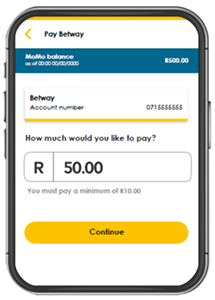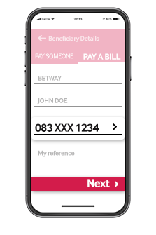 - Enter your Betway Account Number (mobile number) as your Bill Account Number