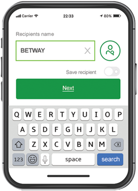 2Navigate to Once off payments3Select Public Recipient4Search for Betway5Enter your Betway account number (mobile number) as the recipient reference